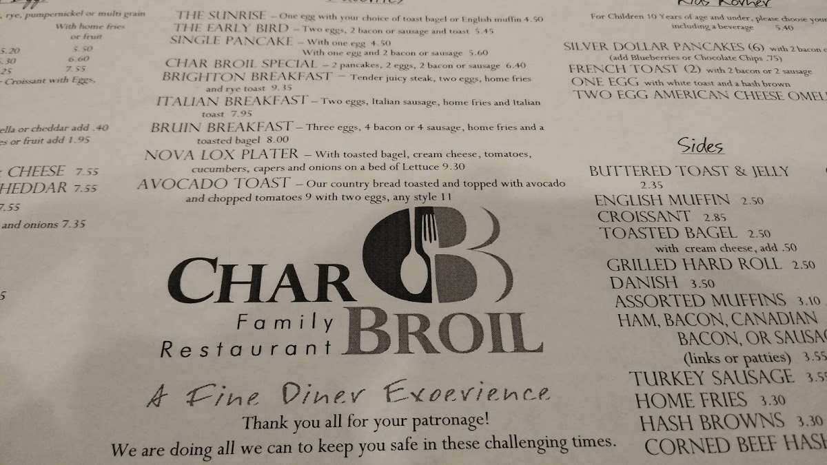 Upon entering Char Broil, you're immediately welcomed by a friendly staff that mirrors the restaurant's dedication to exceptional service. Whether you're stopping by for a hearty breakfast or a satisfying dinner, the menu features an impressive array of options designed to cater to everyone's taste buds. Imagine starting your day with their New England Clam Chowder, available only on Fridays for just $5.25, or diving into a generous homemade chili topped with cheese and onion for $9.05. The flavors here are both comforting and familiar, making each bite a reminder of home.